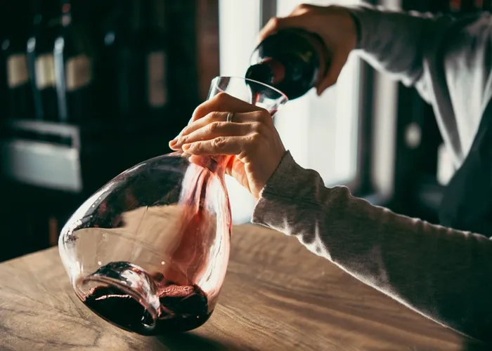 - Rót rượu: Đổ nhẹ nhàng rượu từ chai sang bình decanter, tránh làm rượu vang sục khí quá mạnh.
